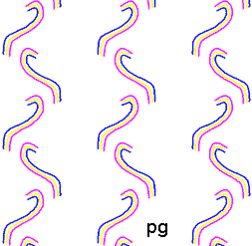 - Группа p4g имеет два центра поворота порядка четыре (90°), которые являются зеркальным отражением друг друга, но она имеет отражения только в двух перпендикулярных направлениях. Имеются вращения порядка два (180°), центры которых расположены на пересечении осей отражения. Группа имеет оси скользящих симметрий, параллельные осям отражения (между ними), а также под углом 45° к ним.