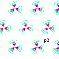 - Группа p3 имеет три различных центра порядка три (120°), но не имеет зеркальных или скользящих симметрий.