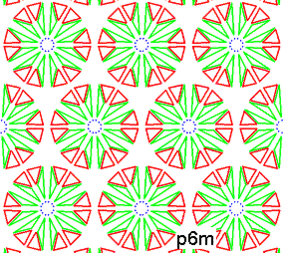 - Группа p6m имеет один центр вращения порядка шесть (60°). Она имеет также два центра вращения порядка три, которые отличаются только вращением на 60°, и три порядка два, которые отличаются только вращением на 60°. Группа имеет также отражения в шести различных направлениях. Существуют дополнительные скользящие симметрии в шести различных направлениях, оси которых расположены посередине между двумя смежными параллельными осями отражения.