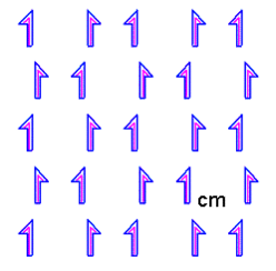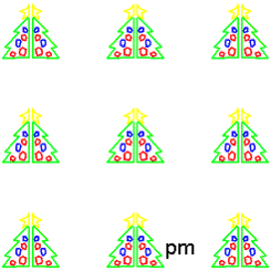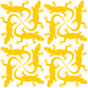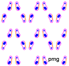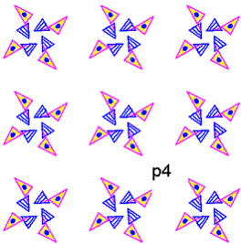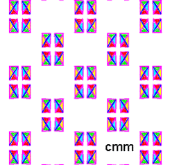 - p4gm (p4mm): Примитивная ячейка, 4-кратная симметрия вращения, скользящая симметрия, перпендикулярная главной оси, ось зеркальной симметрии под углом 45°.