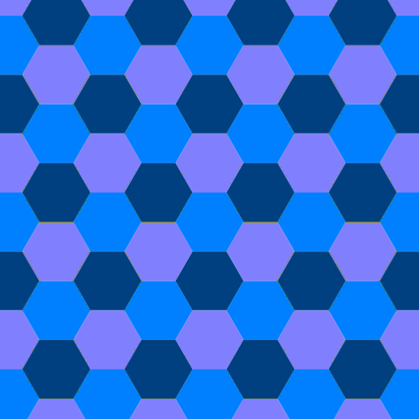 Эквивалентно, представим замощение плоскости правильными шестиугольниками со стороной, равной наименьшему параллельному переносу, делённому на √3. Тогда эта группа обоев соответствует случаю, когда все шестиугольники равны (и имеют одну и ту же ориентацию) и имеют симметрию вращения порядка три, но при этом нет зеркального отражения (если они имеют вращательную симметрию порядка шесть, получим p6, если есть симметрия относительно главной диагонали, имеем p31m, если есть симметрия относительно прямых, перпендикулярных сторонам, имеем p3m1; если выполняются два из трёх этих свойств, то третье выполняется тоже и мы имеем p6m). Для заданного образа существует три замощения, каждое получается при расположении центров шестиугольников в центрах вращения узора. В терминах рисунка — центрами шестиугольника могут быть красные, синие и зелёные треугольнички.