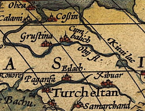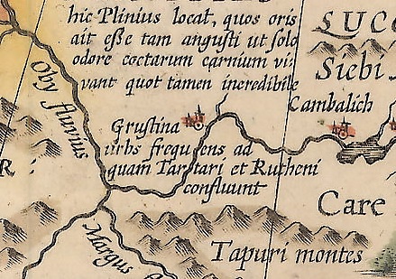 От устья реки Иртыша до крепости Грустины два месяца пути; от неё до озера Китая рекою Обью, которая, как я сказал, вытекает из этого озера, более чем три месяца пути. От этого озера приходят в большом множестве чёрные люди, лишённые общего всем дара слова; они приносят с собой много товаров, преимущественно же жемчуг и драгоценные камни, которые покупаются грустинцами и серпоновцами. Они называются лукоморцами от Лукомории, лежащей в горах, по другую сторону Оби от крепости Серпонова. <…> Грустинцы и серпоновцы ведут с ними торговлю <…> По левому берегу реки Оби, вниз, живут каламы, которые переселились туда из Обиовы и Погозы. За Обью, у Золотой Бабы, где Обь впадает в океан, текут реки Сосва, Березва и Данадим, которые все берут начало из горы Камень Большого Пояса и соединённых с ней скал. Все народы, живущие от этих рек до Золотой Бабы, называются данниками князя московского.[1]