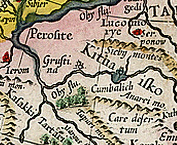 Однакожъ Москвитяне уже знали имена всѣхъ главныхъ рѣкъ Западной Сибири. Они сказывали, что Объ вытекаетъ изъ озера (Телейскаго); что за сею рѣкою и за Иртышёмъ находятся два города, Серпоновъ и Грустина, коихъ жители получаютъ жемчугъ и драгоцѣнные каменья отъ чёрныхъ людей, обитающихъ близъ озера Китая. Мы обязаны были сими свѣдѣніями господству Великихъ Князей надъ землёю Пермскою и Югорскою. [3]