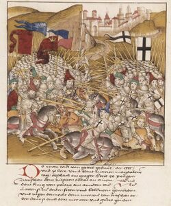 Грюнвальдская битва (Битва при Танненберге) — решающее сражение Великой войны 1409—1411 годов, происшедшее 15 июля 1410 года. Союз Королевства Польского и Великого княжества Литовского под предводительством короля Владислава II Ягайло и великого князя литовского Витовта одержал решающую победу над войском Тевтонского ордена. Большинство рыцарей ордена было убито или взято в плен. Несмотря на поражение, крестоносцы смогли выдержать двухмесячную осаду столицы и понесли лишь незначительные территориальные потери в результате Торуньского мира 1411 года. Территориальные споры продолжались до заключения Мельнского мира 1422 года. Тем не менее Тевтонский орден так и не смог оправиться от поражения, а жёсткие внутренние конфликты привели к экономическому упадку. Грюнвальдская битва привела к перераспределению баланса сил в Восточной Европе и ознаменовала восход польско-литовского союза до уровня доминирующей военно-политической силы в регионе.