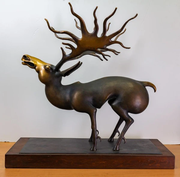 Скульптура представляет собой анималистическую композицию на неразъемном постаменте. Изображён олень с мощными ветвистыми рогами. Фигура оленя установлена на плоской прямоугольной пластине, закреплённой на деревянном постаменте. Животное изображено в динамично напряженной позе. Корпус собран, колени подогнуты, хвост поднят, шея вытянута, голова поднята, рот приоткрыт, ноздри раздуты. Голова и короткий хвост выполнены в золотистом тоне, корпус имеет тёмное окрашивание. Патинирование рогов создаёт переход от золотистого к тёмному оттенкам. Размеры произведения составляют 66×70×43 см.