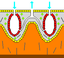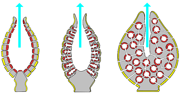 Простейший вариант строения губок — асконоидный, при котором имеются обширная хоаноцитная выстилка мезохила и наружный слой пинакоцитов, который связан со слоем хоаноцитов узкими проводящими каналами; хоаноцитная полость открывается непосредственно оскулярным отверстием. Асконоидных губок иногда называют гомоцельными, потому что водоносная система у них выстлана только хоаноцитами. У видов с более сложным строением некоторые участки водоносной системы сформированы пинакоцитами, а не хоаноцитами, и такие губки называются гетероцельными[31]. Асконоидные губки обычно имеют вид соединяющихся (анастомозирующих) трубочек, не превышая в диаметре 1 мм. Например, у представителей рода Leucosolenia такие трубочки соединяются основаниями и собраны в пучки, а у Clathrina тело представлено трубчатой сетью[32]. Для увеличения размера тела при сохранении асконоидной организации можно было бы увеличивать размер атриальной полости и/или объём мезохила. Однако ни то, ни другое невозможно по физическим причинам: при слишком большом объёме атриальной полости в ней происходил бы застой воды, так как оптимальное соотношение площади поверхности и объёма было бы нарушено и площади поверхности хоанодермы не хватало бы для эффективной прогонки воды, а чрезмерное увеличение объёма мезохила помешало бы поверхностному слою клеток адекватно обслуживать протекающие там процессы[33][32].