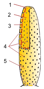 Поверхность тела губки, а также каналы водоносной системы образованы уплощёнными, плотно прилегающими друг к другу клетками — пинакоцитами. Расширенные участки каналов, именуемые хоаноцитными, или жгутиковыми камерами, выстланы хоаноцитами — клетками, снабжёнными жгутиком и способными к фильтрации пищевых частиц и созданию тока воды в водоносной системе. Входное отверстие хоаноцитной камеры называется прозопиль, а выходное — апопиль. Слои пинакоцитов и хоаноцитов разделены мезохилом — внутренним пространством губки, которое непосредственно не сообщается с водой[22]. Подробно строение и состав клеток губок будут рассмотрены ниже.
