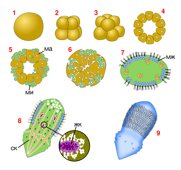 - сферульные клетки заполнены крупными округлыми включениями различной природы и химического состава. Вся их цитоплазма заполнена крупными включениями, ограниченными мембранами (сферулами). Обычно сферульные клетки локализуются в эктосоме вдоль каналов водоносной системы. Их функции разнообразны: они содержат токсические метаболиты, участвуют в экскреции, аккумулируют лектины, участвуют в поддержании внеклеточного матрикса;