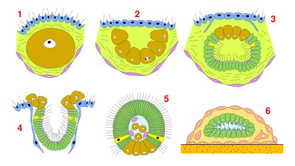 Однако последняя треть XIX века стала, по выражению А. В. Ересковского, «золотым веком» эмбриологии губок (и первым этапом систематических исследований их развития)[8]. В 1874—1879 годах исследования И. И. Мечникова, Франца Шульце и Оскара Шмидта, посвящённые изучению строения и развития губок, неопровержимо доказали их принадлежность к многоклеточным животным. Одновременно было обнаружено большое своеобразие данной группы животных. В частности, Шульце (1878) и Ив Делаж (1892) описали так называемое явление «извращения зародышевых листков» при развитии губок, резко отличающее Porifera от всех других Metazoa (включая кишечнополостных); впрочем, в конце XX — начале XXI века терминология изменилась: стало преобладать мнение, по которому у губок зародышевые листки в ходе эмбриогенеза вообще не формируются, а потому об их «извращении» говорить нет смысла[14][15]. Поэтому Уильям Соллас (1884) противопоставил губок как Parazoa всем остальным Metazoa (получившим вскоре название Eumetazoa). В поздней системе Геккеля (1894—1895) губки уже выведены из состава Protista и рассматриваются в царстве животных как самостоятельный тип Spongiae, а в системе Рэя Ланкестера (1900—1909) они со всей определённостью отнесены к Metazoa и фигурируют как тип Porifera (единственный в разделе Parazoa). Эта последняя точка зрения и являлась абсолютно преобладающей на протяжении почти всего XX века, хотя ранг Parazoa у разных авторов варьирует: то это «раздел», то — «надраздел», то — «подцарство»[3][16][17].