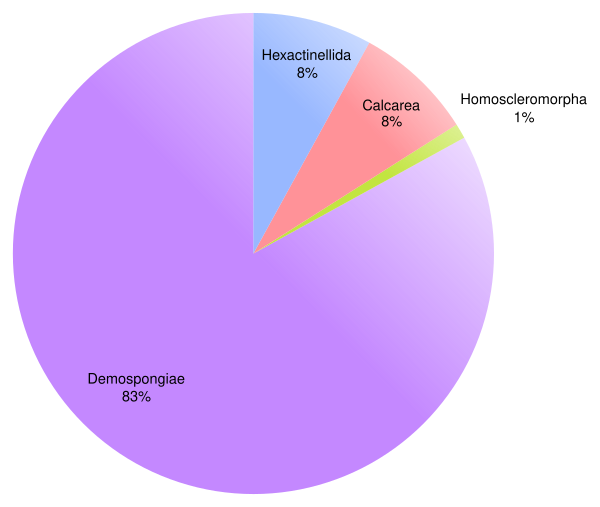 В настоящее время известно около 8000 (по другим оценкам, более 15000[138][225]) видов губок, из которых 219[138] (по другим данным, 150[32]) — пресноводные. Современные виды губок разделены на четыре класса[226].