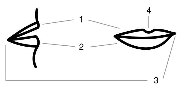 От щёк верхняя губа отделена носогубной складкой. Нижняя губа отграничивается от подбородка горизонтально идущей подбородочно-губной бороздой. У обоих углов рта имеются соединения той и другой губы посредством губных спаек.