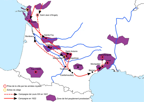 В 1621 году Людовик XIII вознамерился искоренить то, что он считал открытым восстанием против его власти. Он повел армию на юг, захватил город гугенотов Сомюр и добился успеха в осаде Сен-Жан-д’Анжели против брата Рогана, герцога Субиза[4]. Небольшое количество войск под командованием графом Суассона пытались окружить Ла-Рошель (блокада Ла-Рошели), но Людовик XIII с основной армией решил двигаться дальше на юг и осадил Монтобан (Окситания), но здесь его армия исчерпала свои ресурсы, и осада была снята.