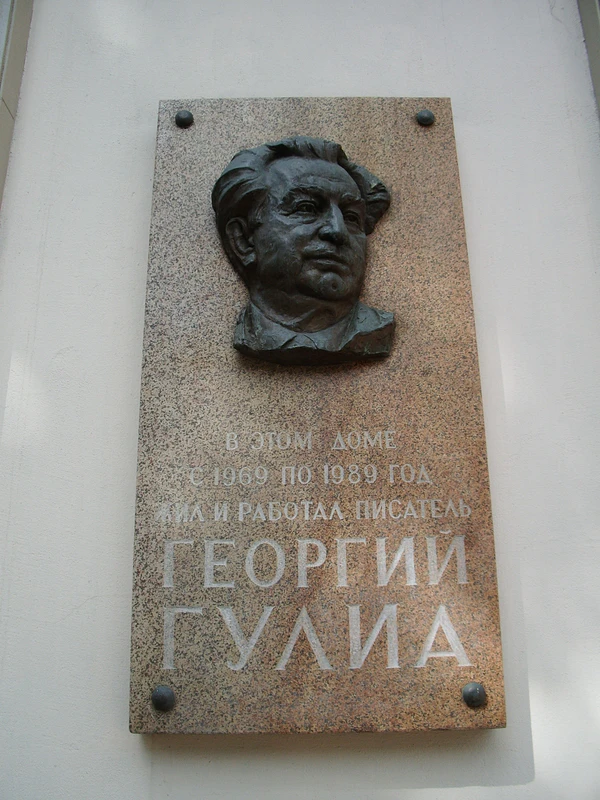 С 1969 по 1989 год Георгий Гулиа жил в Москве по адресу: Новопесчаная улица, дом № 16. В память об этом на доме в 2002 году установлена мемориальная доска.