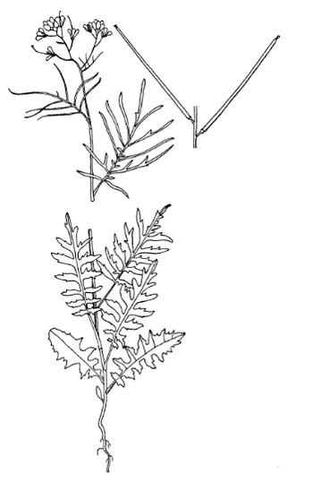 Нижние листья черешковые, перисто-раздельные, с удлиненными линейными долями. Чашелистики длиной 4—5 мм, голые, ланцетные.