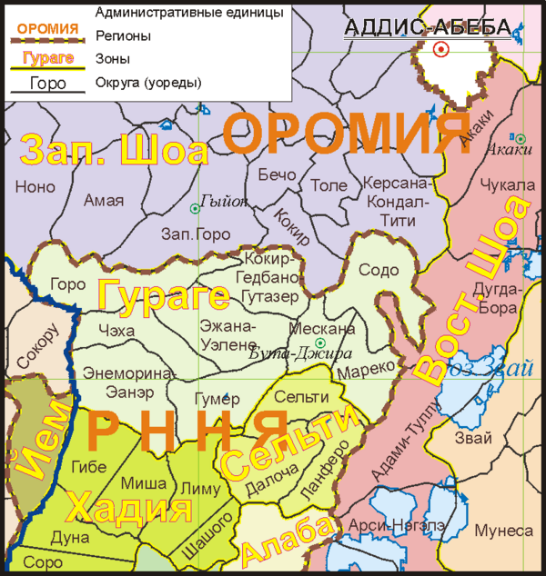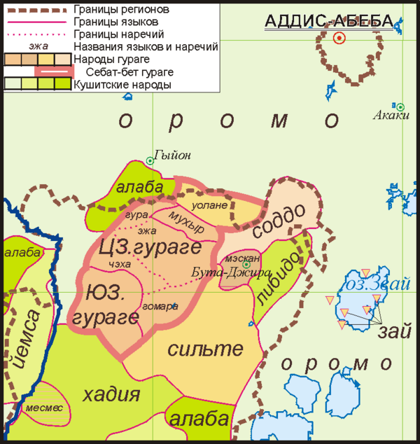 - зай (звай) — 7,1 тыс. чел. на островах и побережье оз. Звай (регион Оромия). Звай — это название озера и города, а зай — (само)название языка и народа. Христиане, но не считают себя гураге.