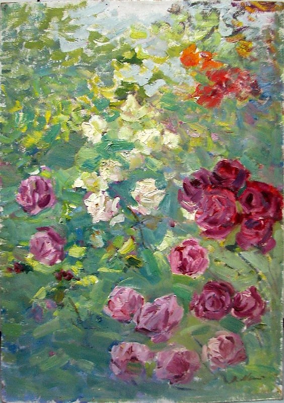 На картине изображены кусты цветущих роз с распустившимися бутонами розового, красного и белого цветов. Работа выполнена в характерной для импрессионизма живой и насыщенной манере, с акцентом на передачу разнообразия оттенков в цветовой гамме.