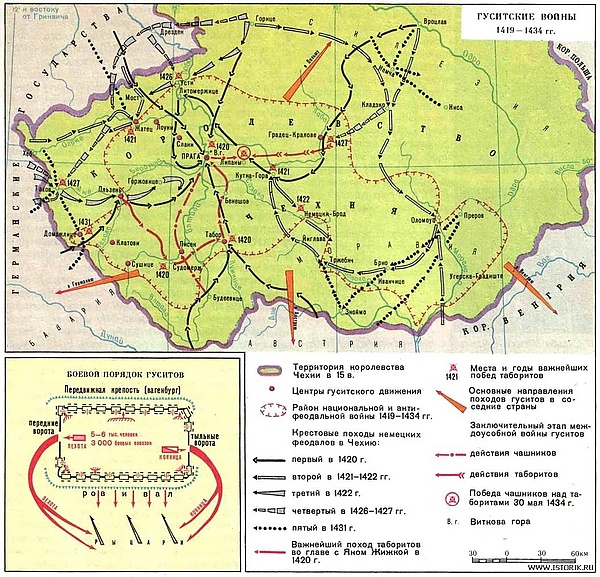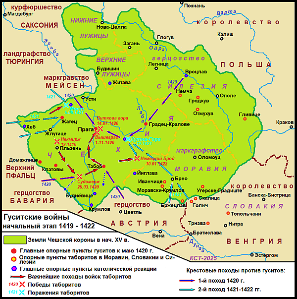 Первоначально гуситы сплочённо воевали против католиков, организовавших против них серию крестовых походов, позднее их движение разделилось на умеренных («чашников»), примирившихся с католиками, и радикалов («таборитов»), потерпевших поражение.