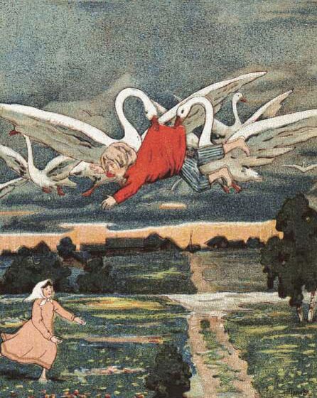 - Печка, речка и яблонька — чудесные помощники, но только на обратном пути (девочка выполняет их требования), помогают спрятаться от гусей-лебедей.