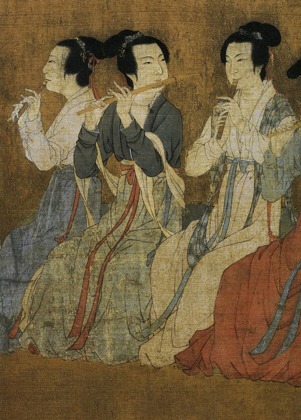 - пять женщин играют на трубах и флейтах под управлением дирижёра с трещоткой