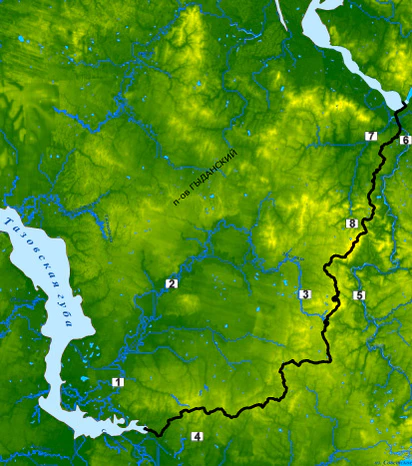 Сухопутная граница полуострова[3][4] начинается от восточной точки общего устьевого створа рек Таз и Малый Таз в месте впадения реки Маномяхи в основное русло реки Малый Таз и проходит по водоразделу, отделяющему бассейн реки Мессояхи и её притоков (реки: Мерояха, Индикъяха, Мудуяха, Нядаяха, Нянгусяха) от бассейна реки Таз с его притоками (реки Лимбяяха, Хэяха, Русская (Луцеяха)). Далее на северо-восток, ближе к бассейну реки Енисей, граница проходит по водоразделу между рекой Солёной с её притоками (реки: Торча, Хэяха, Пендамаяха, Петровская) и бассейном реки Большой Хеты до устья этой реки. Далее по левому берегу Енисея до финального створа приустьевого участка русла Енисея, который фиксируется прямой линией, проведенной от нижнего конца (ухвостья) Фунтусовского полуострова в устье протоки Фунтусова (точка с координатами 69°36′40″ с. ш., 84°32′40″ в. д.[5][6]) до мыса Крестовский на противоположном правом берегу Енисея[3].