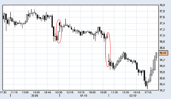 Иногда гэпом также называют существенную разницу между соседними котировками. Обычно это обусловлено неожиданными новостями, когда разница между котировками может быть в 5 и более раз больше обычной. На графике такой гэп не всегда отображается в виде разрыва, он может сформировать удлинённый элемент.