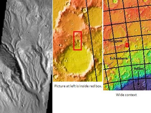 Ученые были приятно удивлены, увидев разветвленные каналы на снимках, сделанных при космических станций, постоянно вращающихся вокруг Марса («Марс Экспресс», «Марс Одиссей» и MRO). Существование таких каналов является убедительным доказательством того, что большое количество воды когда-то текло по поверхности планеты. Простые организмы, вероятно, жили в тех местах, где скапливалась вода. Группа таких каналов показана на рисунке ниже.
