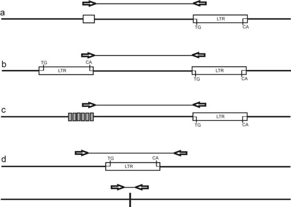 - IRAP Архивная копия от 30 октября 2016 на Wayback Machine (англ. Inter Retrotransposone Amplified Polymorphism)[12][13] — полимеразная цепная реакция между праймерами, комплементарными последовательностям двух рядом расположенных LTR ретротранспозона. Метод имеет несколько вариантов. В первом варианте IRAP используется единичный праймер из LTR. Продукты амплификации образуются между двумя инвертированными LTR с одинаковой последовательностью, то есть в одной цепи 5’-конец одного LTR ориентирован к 3’-концу другого LTR. Если центральная часть ретротранспозона длиннее обычного размера продуктов ПЦР (около 3000 пар оснований), то ПЦР будет проходить только между двумя LTR из разных ретротранспозиций. В этом случае соседние LTR должны располагаться в инвертированном положении. В другом варианте IRAP используются два разных праймера к инвертированным LTR: один праймер с 5’-конца, а другой с 3’-конца LTR, ориентированные в разные стороны от ретротранспозона. В данном случае соседние LTR располагаются как прямые длинные повторы. И, наконец, в третьем варианте IRAP используются праймеры к LTR из разных ретротрапозонов в различной ориентации. Можно комбинировать праймеры из LTR с другими праймерами из повторяющейся ДНК.