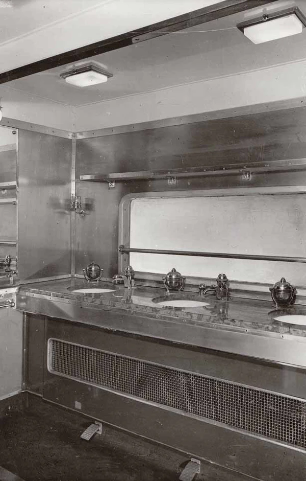 В моторных вагонах за кабинами управления располагалось машинное отделение, в котором находились дизели. Далее у одного из вагонов шли отделения для почты, кухня, тамбур, буфет, пассажирское помещение на 44 места (по два в каждом ряду справа и слева от среднего прохода), туалет и умывальник; у другого моторного вагона за машинным отделением шли помещение для багажа, тамбур, четыре шестиместных купе и туалет[2].