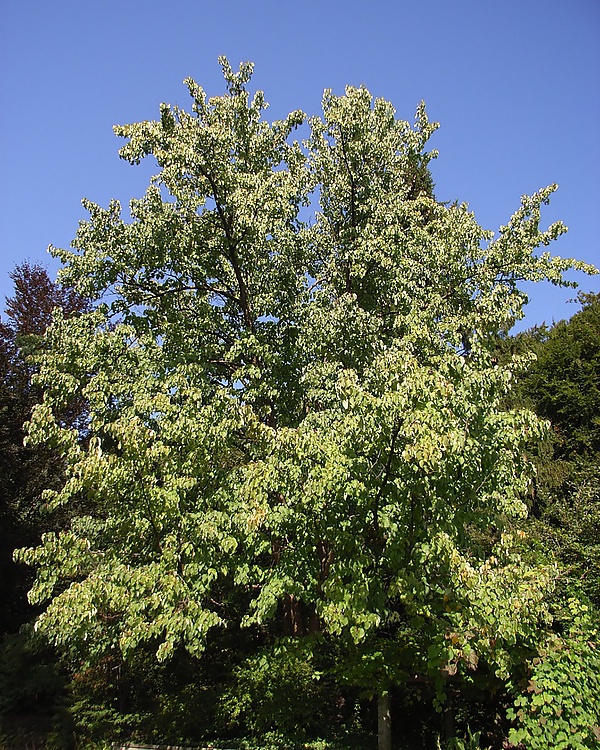 Листопадное дерево высотой до 25 м. Листья простые, пильчатые, сердцевидные, напоминающие листоя липы.