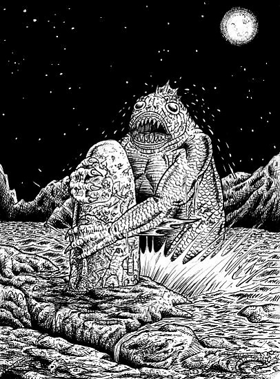 От нас требовалось только регулярно приносить им кого-нибудь в жертву, снабжать всякими дикими безделушками да еще давать приют в юроде - вот тогда они готовы были оставить нас в покое. Так все мы и оказались в этом Ордене Дагона - зато дети никогда не умирали, а просто возвращались назад к Матери Гидре и Отцу Дагону, от которых мы все когда-то произошли... Йа! Йа! Ктулху Фхтагн! Ф'нглуи мгл`Фнафх Ктулху Р'лия вга-нагл фхтага'.
