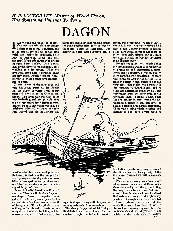 Lovecraft, Howard P. [1923] (1986). "Dagon". In S. T. Joshi (ed.). Dagon and Other Macabre Tales (9th corrected printing ed.). Sauk City, WI: Arkham House. ISBN 0-87054-039-4.