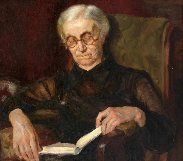 В центре композиции изображена по пояс пожилая женщина, сидящая в фас и читающая книгу. У неё седые волосы, аккуратно зачёсанные на пробор и убранные на затылке, на глазах круглые очки, прямой нос и сжатые губы. Правая рука женщины согнута и лежит на столе, а пальцы левой придерживают раскрытую книгу. Она сидит в кресле из красного дерева с обивкой охристо-зелёного оттенка. Фон картины выполнен в тёмно-красной цветовой гамме.