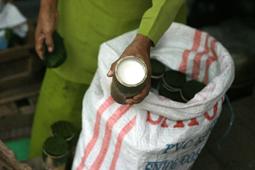 Дадих, приготовленный традиционным образом в бамбуковом коленце, в нём же и хранится до момента употребления. В районах проживания минангкабау на Суматре бамбуковые обрезки, заполненные дадихом, повсеместно продаются в традиционных лавочках или с лотков уличных разносчиков. Дадих фабричного производства поступает в продажу в магазины современного типа[3][4].