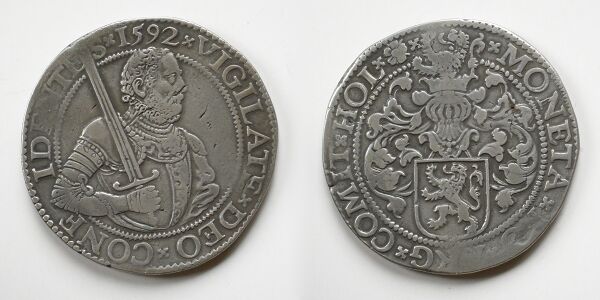 На аверс монеты, впервые отчеканенной в 1583 году в Дордрехте, помещён Вильгельм I Оранский с мечом в правой руке. Отсюда её первое название — рейксдальдер с бюстом Вильгельма Оранского. Круговая легенда на аверсе «VIGILATE DEO CONFIDENTES» обозначает «Бодрствуйте, уповая на Бога»[1][2]. Вероятнее всего, этот сюжет — рыцарь с мечом — был заимствован с талеров саксонских курфюрстов, в частности, Морица Саксонского, тестя Вильгельма Оранского[3].
