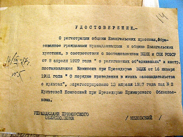 В первых числах февраля во Владивостоке арестован весь состав дальневосточного совета Евангельских христиан. Некоторые уже высланы в Соловки. Судьба других неизвестна. На Дальнем Востоке верующие объявлены контрреволюционерами. Во Владивостоке верующие лишены религиозных собраний»[10].