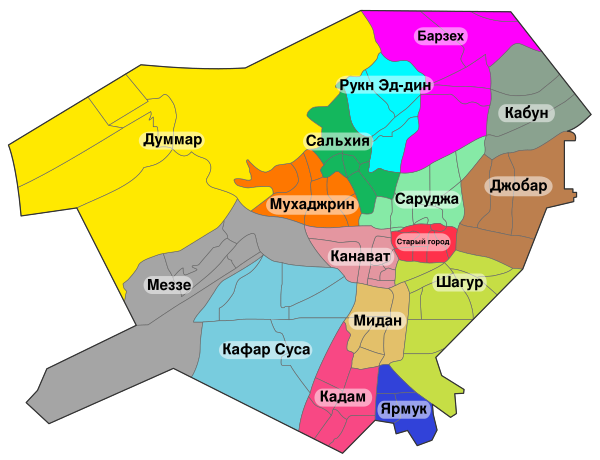 Район старого города с остатками фортификационных сооружений находится на южном берегу реки Барада, практически пересохшей (средняя высота воды составляет около 3 сантиметров). С юго-востока, севера и северо-востока он окружен районами Аль-Мидан, Саруджа и Имара; их история восходит к периоду Средневековья, когда у ведущих к городу дорог, в непосредственной близости от захоронений религиозных деятелей, возникали поселения. В XIX веке началось активное заселение также и склонов Касиюна (хотя люди жили там и ранее — пригород Эс-Салихия, к примеру, сформировался близ святилища шейха Ибн Араби). Изначально упомянутые поселения строились курдскими военными формированиями и мусульманскими беженцами из европейских регионов Оттоманской империи; они расположены на расстоянии от 2 до 3 километров к северу от старого города.