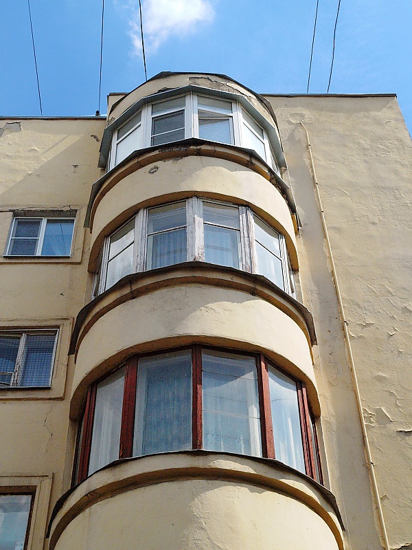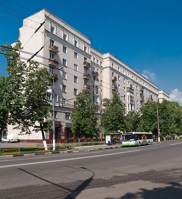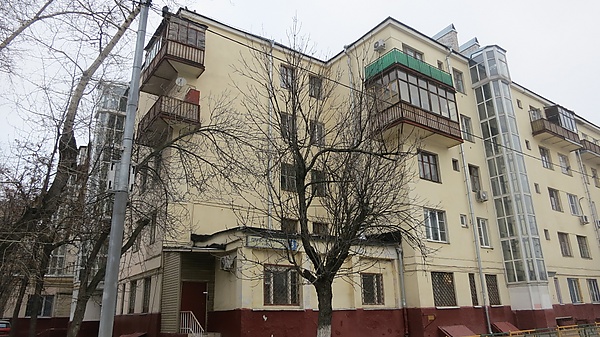 Из запланированных четырёх П-образных домов по проекту 1927—1928 годов было построено только два, выполненных в стиле архитектуры конструктивизма. Один из них — «Дом ударников» заводов «Котлоаппарат» и «Парижская Коммуна» (№ 22 по Авиамоторной улице; 1930—1934), созданный по проекту архитектора Николая Молокова. Он состоит из корпусов, поставленных в двух направлениях, со срезанным под 45 градусов углом, украшенным треугольными балконами. Карнизы в нижней части балконов утрированы повторными тягами, под которыми есть квадратные отверстия водостоков, отчего эти формы напоминают классический карниз с «сухариками», но решённый в преувеличенном масштабе. Здание Молокова отличается также лоджиями с круглыми колоннами[10].