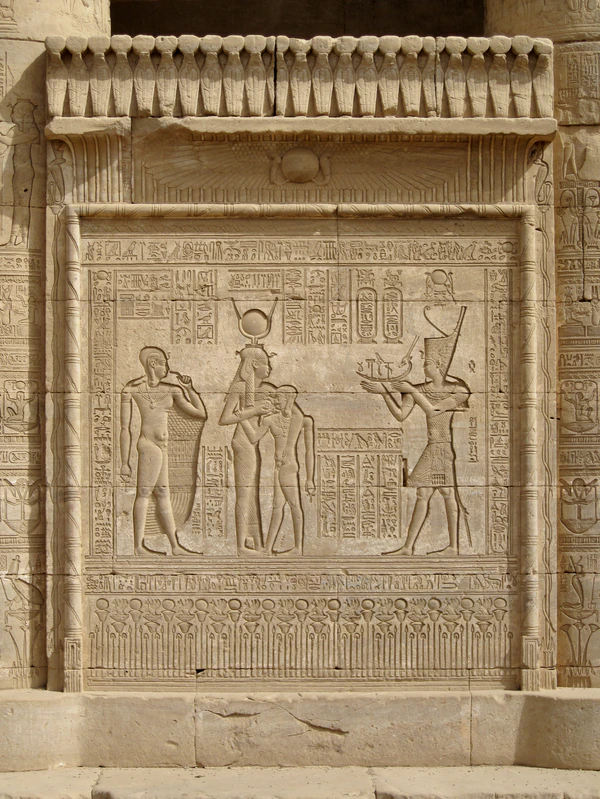 Протяжённостью 79 м комплекс возведён из песчаника, занимает площадь ок. 40000 квадратных метров и окружён кирпичной стеной. Возведение комплекса относится к периоду Птолемеев и завершилось при римском императоре Тиберии. Однако под основанием храмов находятся здания предыдущих эпох, древнейшие могут быть отнесены к царствованию строителя Великой пирамиды — Хуфу (ок. 2613 — ок. 2494 гг. до н. э.). Известно о реставрационных работах при фараоне Пиопи I.