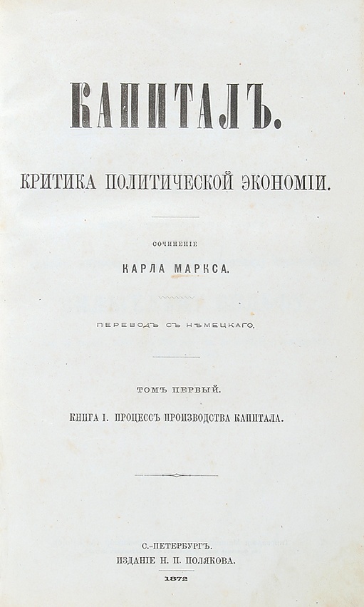- Карл Маркс. Капитал. Критика политической экономии. Том первый. Процесс производства капитала. — Издание Н. П. Полякова, СПб., 1872 г., 692 стр. Тир. 3000 экз.