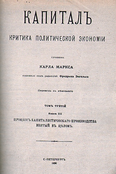 - Карл Маркс. Капитал. Критика политической экономии. Том третий. Процесс капиталистического производства, взятый в целом. Издание под редакцией Фридриха Энгельса. — 1896 г. СПб. Тир. 3020 экз.
