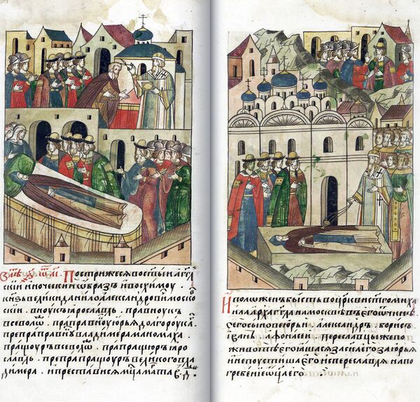 - Одна восходит к сгоревшей в 1812 году в занятой французами Москве пергаментной Троицкой летописи. В своё время эту летопись видел Н. М. Карамзин, который сделал из неё выписку о смерти Даниила Александровича. Эта выписка завершалась словами: «положенъ бысть въ церкви св. Михаила на Москвѣ». Таким образом, местом погребения Даниила послужил, согласно Троицкой летописи, Архангельский собор в московском Кремле[3]. Этой же версии придерживается Лицевой летописный свод.