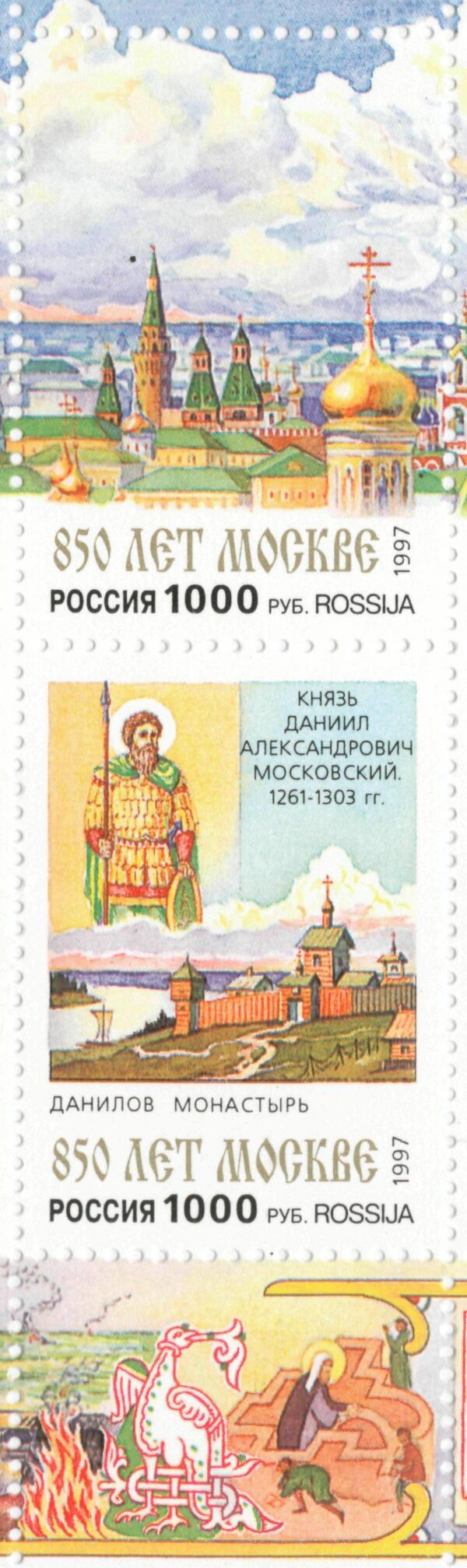 В 1997 году в ознаменование 850-летия основания Москвы на площади Серпуховской заставы установлен памятник князю Даниилу Московскому работы скульпторов А. Коровина и В. Мокроусова, архитектора Д. Соколова[24]. Князь в левой руке держит храм, в правой — меч. Оружие Даниил держит не в боевой готовности, желая показать, что распри, войны и кровопролития — деяния, не угодные Богу. На постаменте памятника барельеф с надписью: «Святой Благоверный великий князь Даниил Московский 1261—1303».