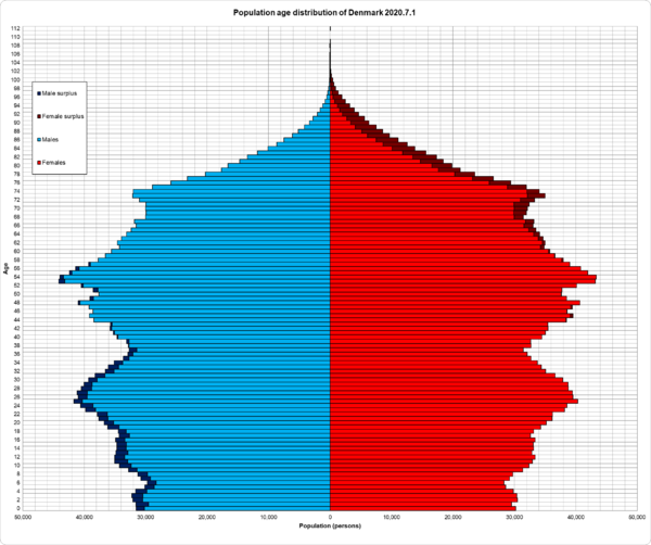 Население на второй квартал 2021 года — 5 843 347 человек[16]. Крупнейшие города — Копенгаген (1 096 187 чел.), Орхус (219 003 чел.), Оденсе (145 300 чел.), Ольборг (120 059 чел.). Средняя продолжительность жизни — 79,52 лет у мужчин, 83,51 — у женщин (2021 год)[17]. Возрастной состав: до 14 лет — 16,42 %; от 15 лет до 64 лет — 63,67 %; от 65 лет и старше — 19,91 % (2020 год)[17]. Средний возраст населения: населения в целом — 42 года; мужчин — 40,9 лет; женщин — 43,1 года (2020 год)[17]. 1 млн учащихся. Более 2 млн семей. Из 100 семей 55 владеют собственными домами.