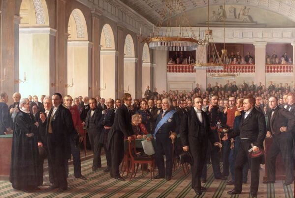 В первой половине XIX века монархи провели ряд либеральных реформ. В 1848 году Фредерик VII созвал учредительное собрание, которое разработало конституцию Дании. Она предусматривала двухпалатный парламент (ригсдаг) и ответственное перед королём правительство. Нижняя палата парламента — фолькетинг — формировалась путём прямых выборов, в которых могли участвовать все мужчины старше 30 лет, выборы в верхнюю палату — ландстинг — были многоступенчатыми. Первую половину XIX века также называют «золотым веком» Дании, поскольку в этот период в стране работал ряд выдающихся деятелей культуры и науки, в том числе скульптор Бертель Торвальдсен, художники Кристоффер Вильхельм Эккерсберг и Кристен Кёбке, физик Ханс Кристиан Эрстед, философ Сёрен Кьеркегор, писатель Ханс Кристиан Андерсен[35][36].