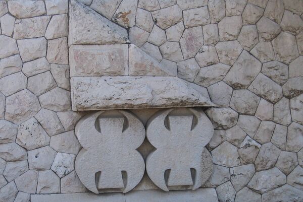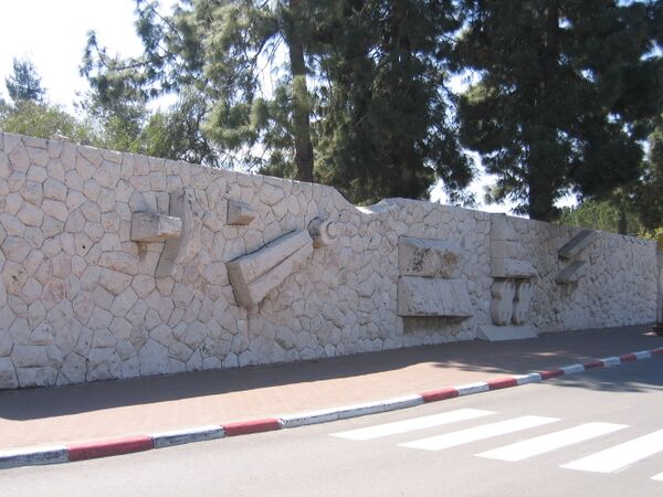 - 1958 — каменные стены, с вырезанными символами Иудейского царства у входа в Еврейский университет, кампус Гиват-Рам, Иерусалим