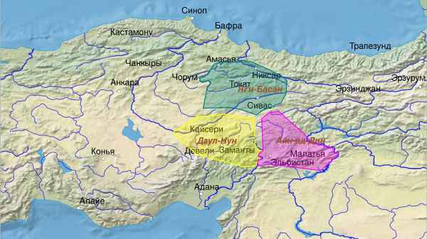 Первоначально власть Данышмендидов распространялась на район Северной Анатолии вокруг городов Токат, Амасья и Сивас [11]. Они укрепились в середине XI века в Никсаре[2].