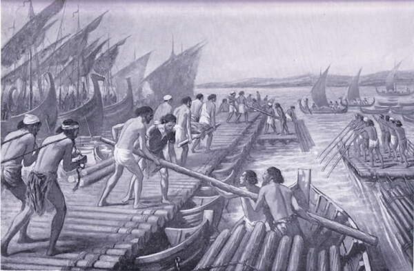 До этого переправу через Дарданеллы от Абидоса к Сесту наводили лишь однажды, в 480 году до н. э., когда по приказу персидского царя Ксеркса I были сооружены два понтонных перехода из связанных между собой кораблей. Первый мост состоял из 360 судов, а второй мост состоял из 314 судов[16]. К моменту возвращения войск переправа была разрушена бурей.