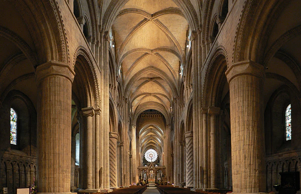 Представляет интерес неф церкви, перекрытый нервюрным сводом, в котором используются одни из первых стрельчатых щёковых[45] арок, с опорой на сравнительно тонкие устои, расчленённые на пучки колонок. Эти столбы перемежаются толстыми круглыми колоннами. Распор свода передаётся на боковые нефы при помощи контрфорсов, скрытых галереей трифория. Эти черты, предшествующие готической архитектуре северной Франции, вероятно, привнесены нормандскими строителями собора. Умелое применение стрельчатых арок и нервюрного свода позволило построить здание на более сложном плане, нежели раньше, а использование контрфорсов — поднять высоту сводов и увеличить окна. В целом, однако, Даремский собор остаётся постройкой романского стиля.