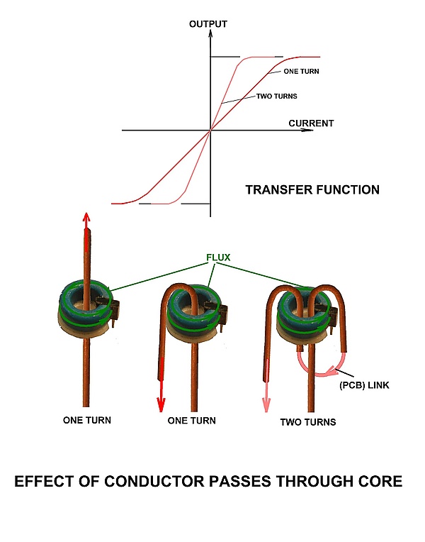 Диапазон данного сквозного датчика может быть расширен вверх и вниз с помощью соответствующей проводки. Чтобы расширить диапазон до более низких токов, можно сделать несколько витков токоведущего провода через отверстие, каждый поворот добавляя к выходному сигналу датчика одно и то же количество; при установке датчика на печатную плату повороты могут осуществляться скобами на плате. Чтобы расширить диапазон до более высоких токов, можно использовать делитель тока. Делитель разделяет ток по двум проводам разной ширины, и более тонкий провод, по которому проходит меньшая часть общего тока, проходит через датчик.