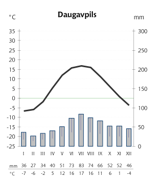 Климат в Даугавпилсе по сравнению с другими регионами Латвии является более континентальным. Температура воздуха летом сравнительно выше, а зимой — ниже, чем в других регионах Латвии[14]. В Даугавпилсе были зафиксированы самая высокая (+36,4 °C — 4 августа 1943 года) и самая низкая (−43,2 °C — 8 февраля 1956 года) температуры в Латвии[15]. Солнце светит в среднем 1809 часов в году[16].